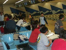 数年前から小学生単独の順位付けを設けました。試合は、2ゲームで、4人一組の団体戦(団体での総得点で順位を競う)と個人別総合得点で順位を競う方法の2通りです。参加者の方々も、年々腕を上げてきており、組み合わせが大変でした。